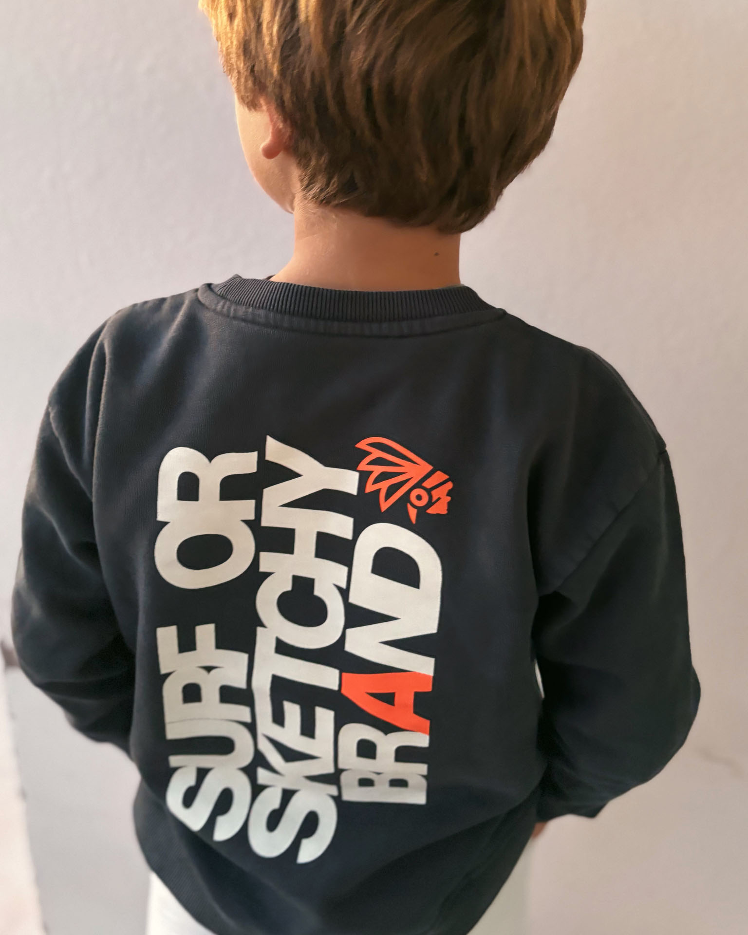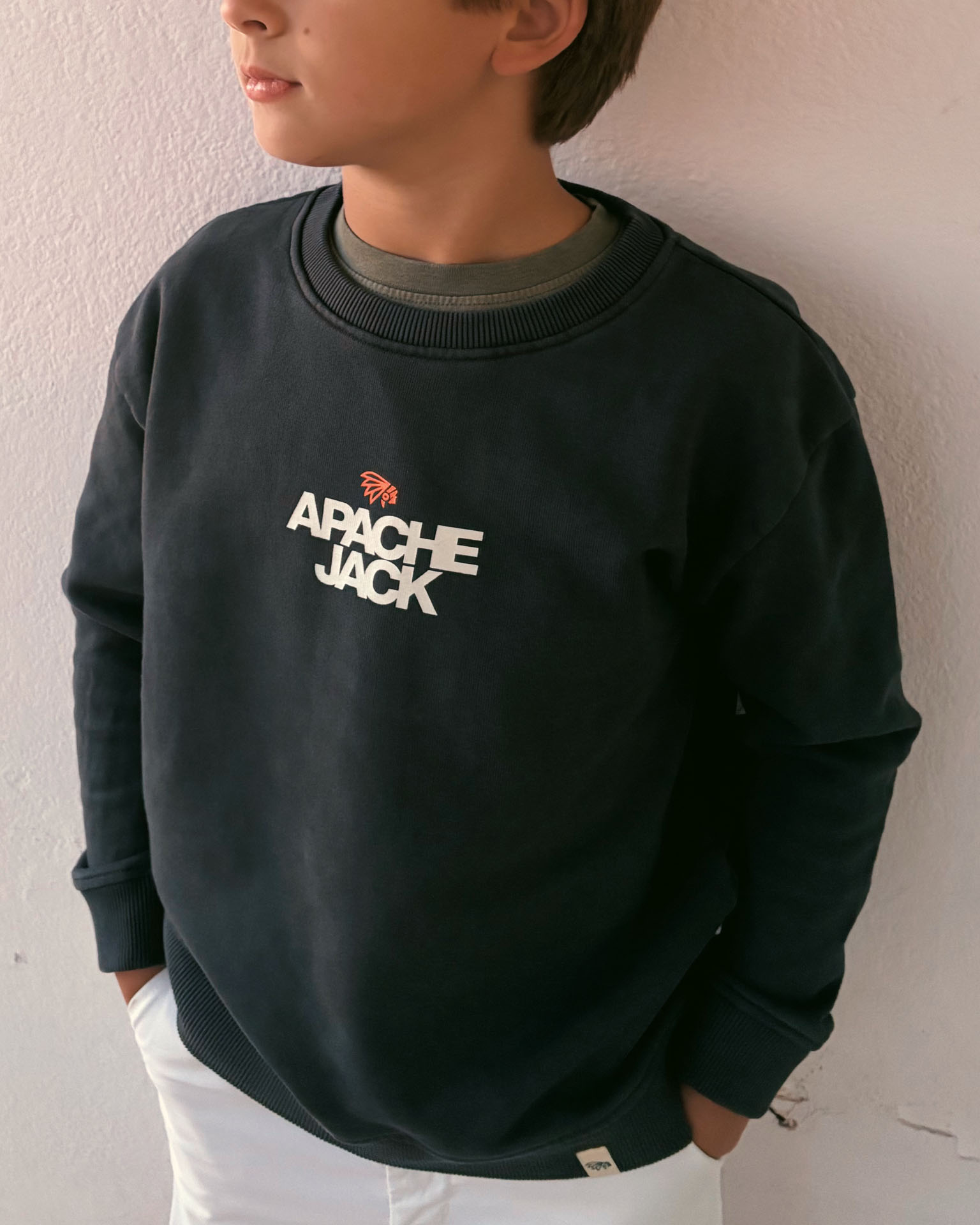 Un print en la parte delantera, con letras en blanco y el apache en naraja flúor. En la espalda, un print con letras en vertical en blanco, excepto la letra A y el apache en naranja flúor.