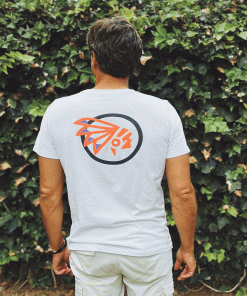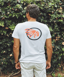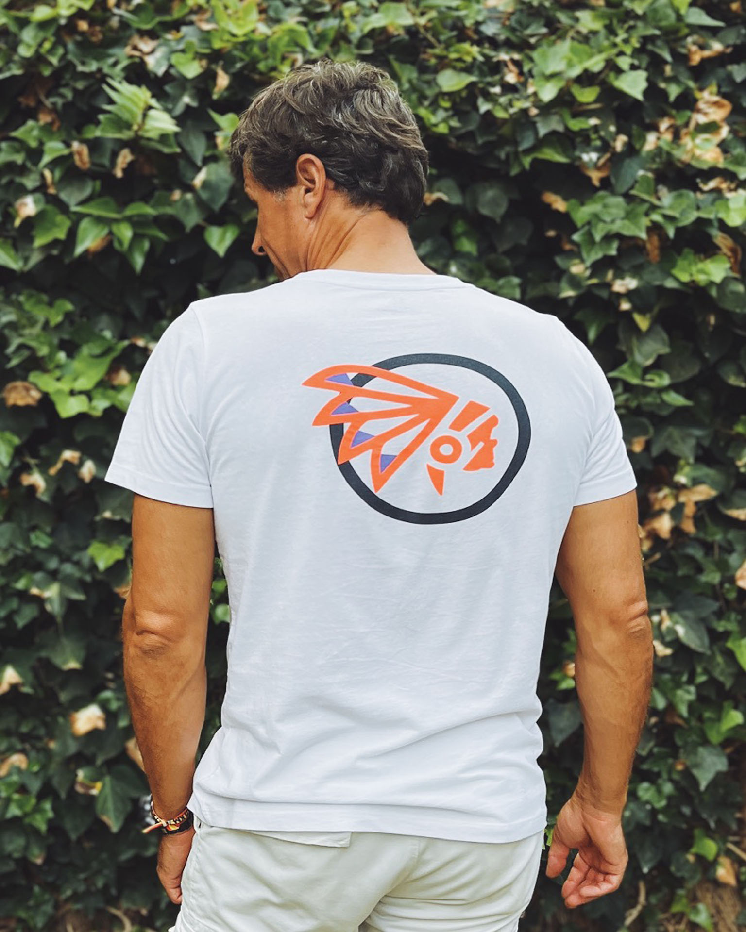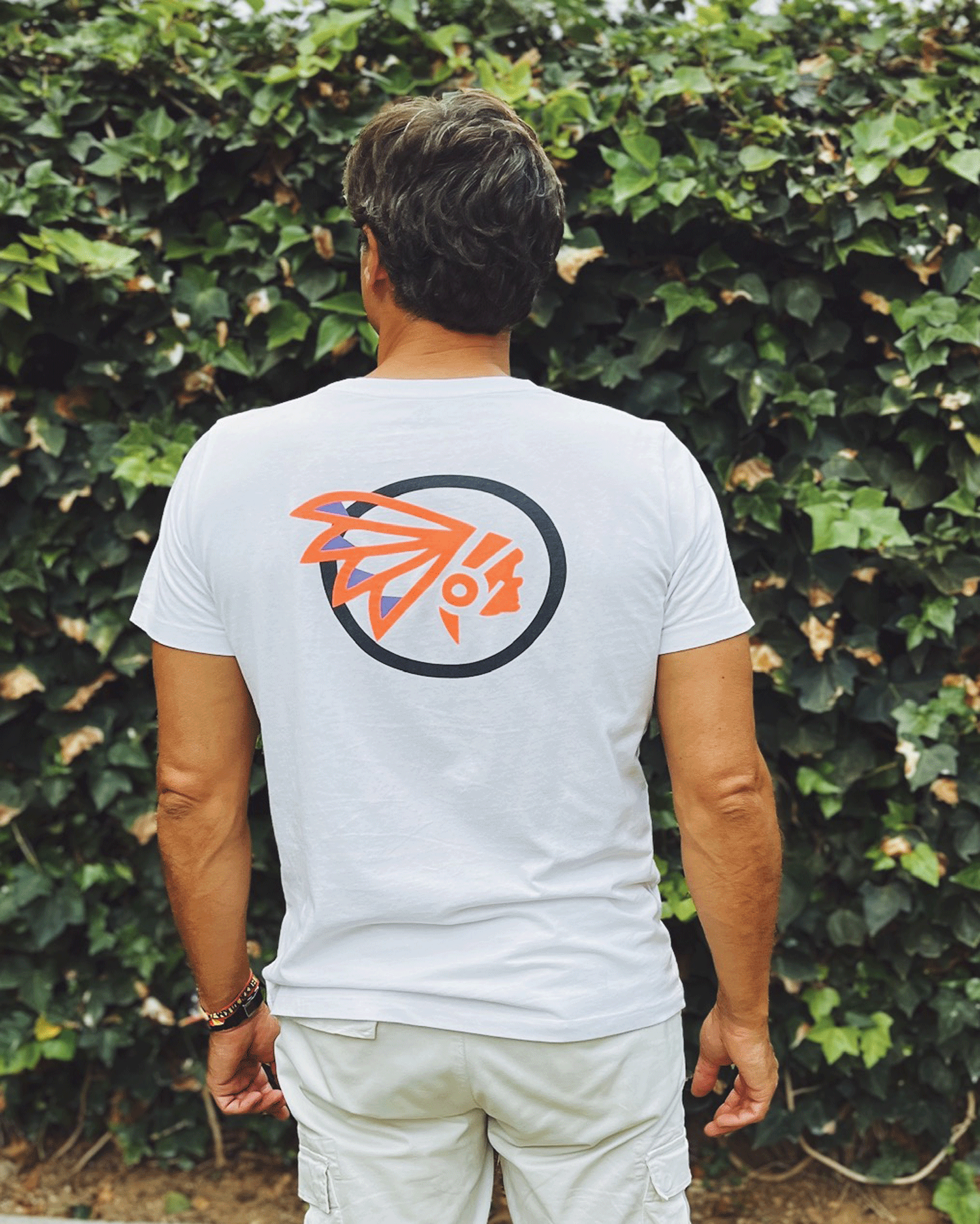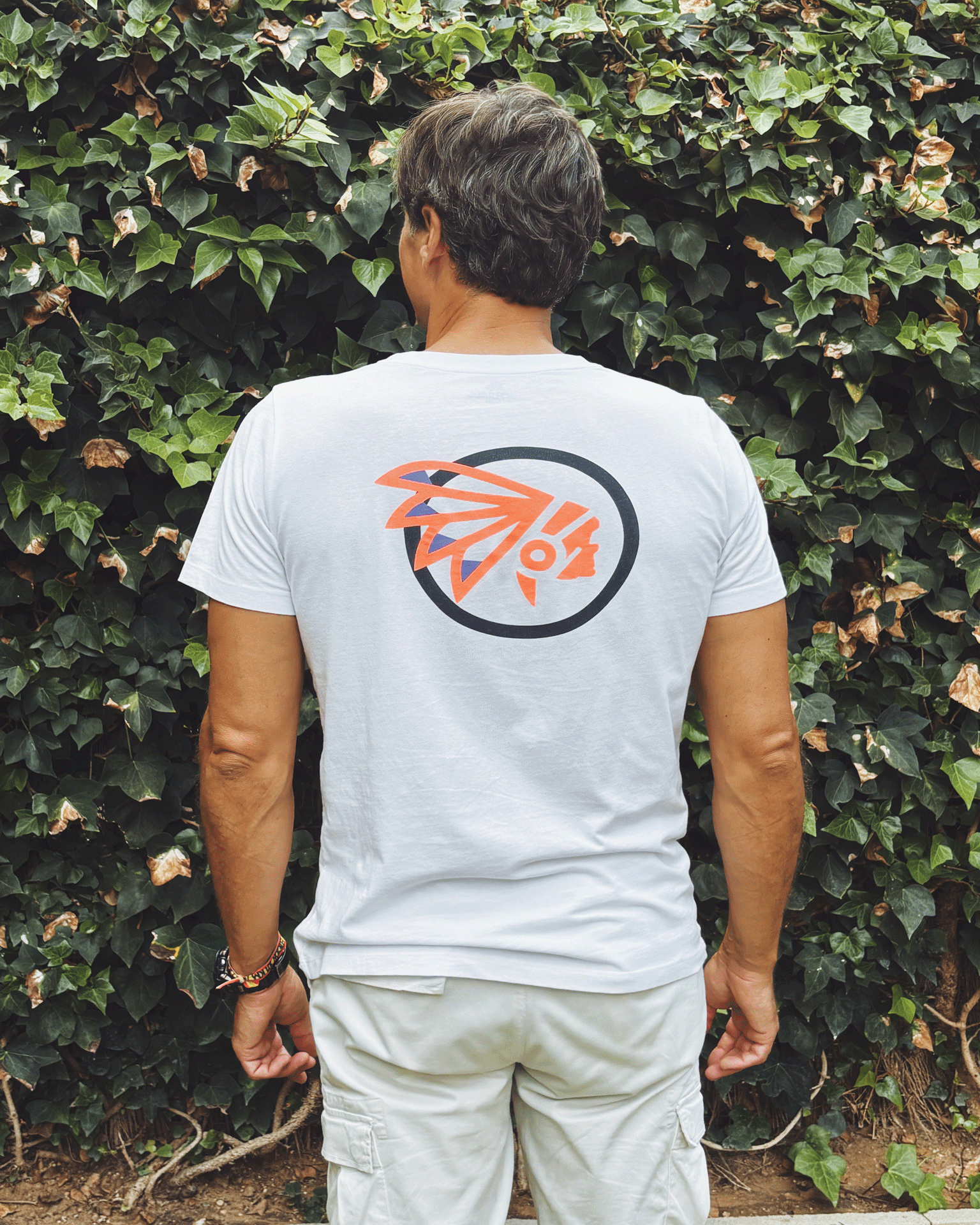 Camiseta con tres prints pequeños en la parte delantera y un print grande en la espalda.